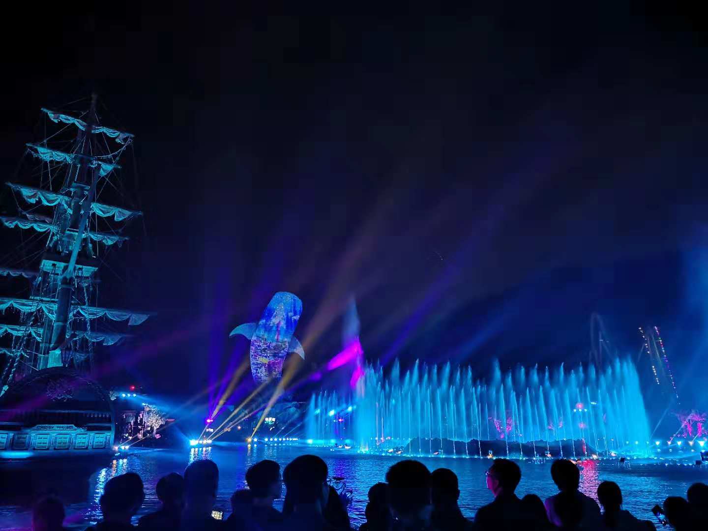 玩了一天,簡單地吃過東西后,晚上欣賞燈光表演和煙花匯演。絢麗多彩的燈光秀結合煙花表演,洗去了大家的疲憊感。