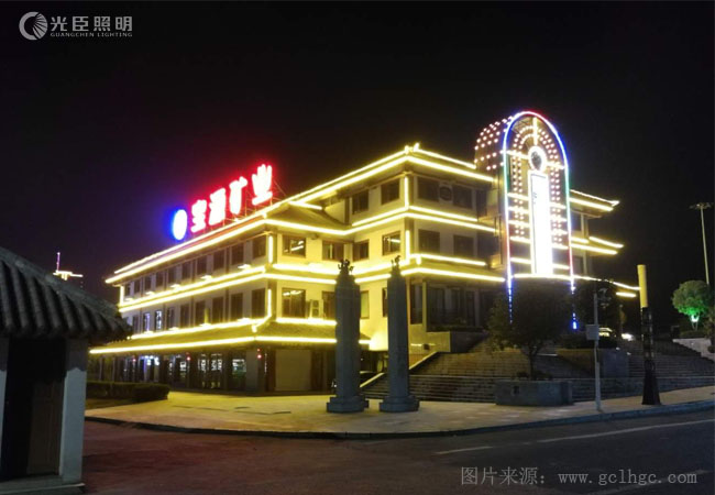 寶源礦業(yè)集團(tuán)是行業(yè)中的標(biāo)桿企業(yè),對(duì)于宏偉的頭門來說怎能少得了亮化修飾,此次工程選用外控七彩線條燈、120MM七彩漸變LED點(diǎn)光源、以及金黃光的2819線條燈、4048洗墻燈組合完成。