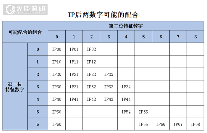 光臣智科同樣沿用國際上采用的字母“IP”(International protection)后面跟兩個數(shù)字來表示燈具的防塵、防水等級。前一位數(shù)字表示對人、固體異物或塵埃的防護能力,后一位數(shù)字表示對水的防護能力,見下圖: