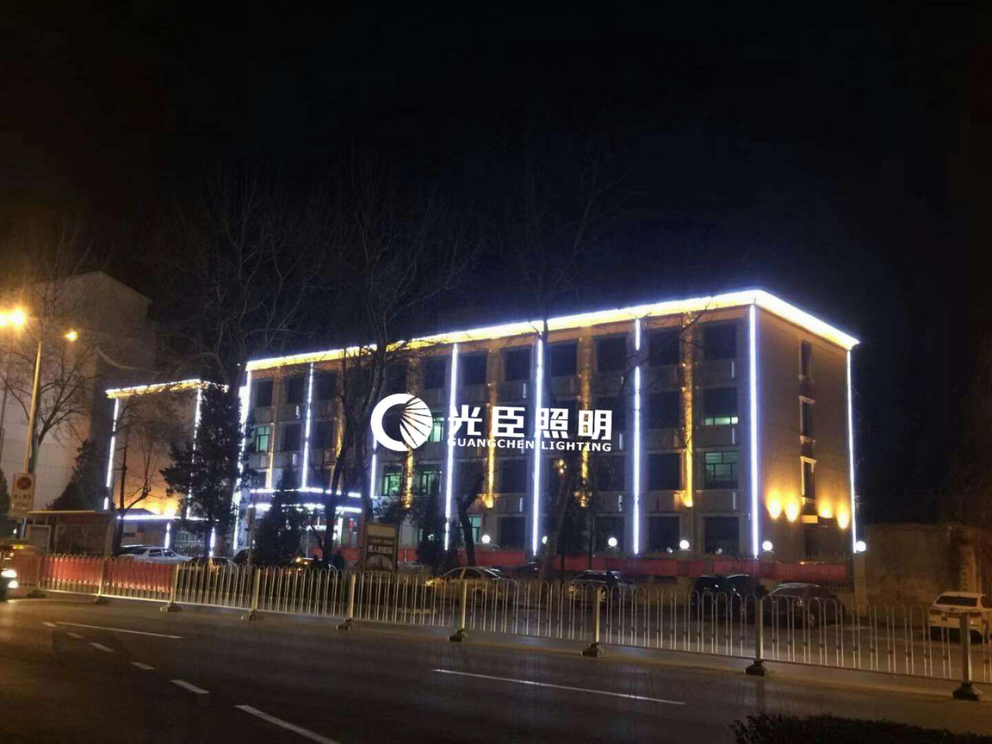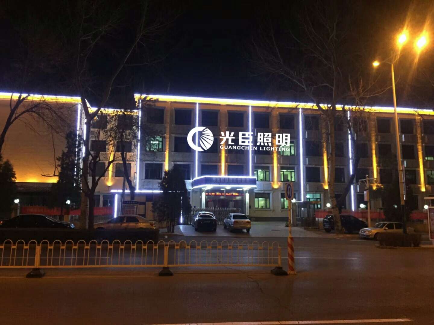 本次亮化主要是以LED白光線條燈做建筑輪廓亮化,柱子用金黃光窄光投射燈,客戶對整體效果和亮度都很滿意。